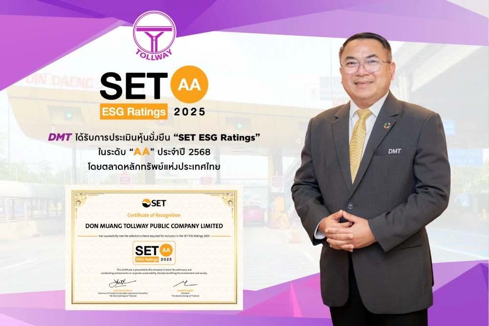 บริษัท ทางยกระดับดอนเมือง จำกัด (มหาชน) หรือ DMT ได้รับการประเมิน SET ESG Ratings ประจำปี 2568 ในระดับ AA และได้รับคัดเลือกให้อยู่ในรายชื่อหุ้นยั่งยืนต่อเนื่องเป็นปีที่ 2 จากตลาดหลักทรัพย์แห่งประเทศไทย สะท้อนศักยภาพการพัฒนาองค์กรอย่างยั่งยืนตามมาตรฐานสากล พร้อมเดินหน้ายกระดับการดำเนินธุรกิจบนแนวทาง ESG อย่างเป็นรูปธรรม และมุ่งสู่การเป็นผู้นำอุตสาหกรรมคมนาคมขนส่งภายใต้แนวคิด Green Road