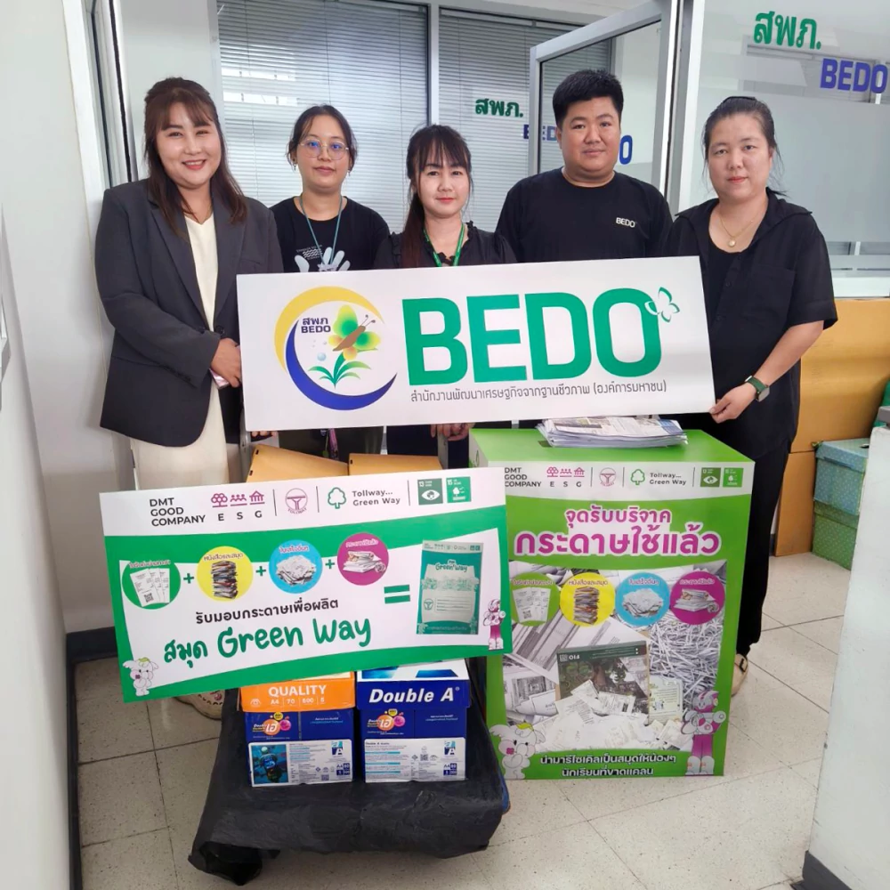 บริษัท ทางยกระดับดอนเมือง จำกัด (มหาชน) หรือ DMT ได้รับมอบกระดาษใช้แล้วจาก BEDO ซึ่งเข้าร่วมเป็นส่วนหนึ่งของโครงการ Tollway Green Way เพื่อนำเข้าสู่กระบวนการรีไซเคิลและผลิตเป็น “สมุด Green Way”