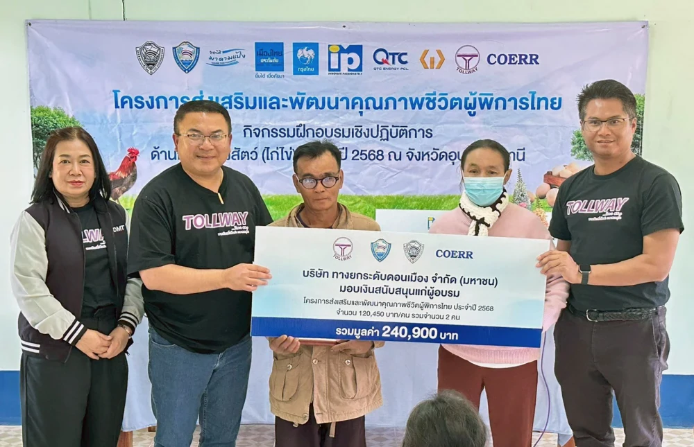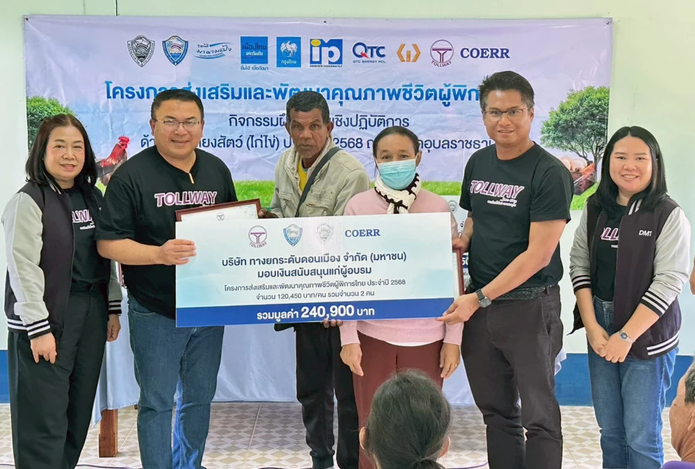 บริษัท ทางยกระดับดอนเมือง จำกัด (มหาชน) นำโดย ดร. ศักดิ์ดา พรรณไวย กรรมการผู้จัดการ ลงพื้นที่มอบทุนการประกอบอาชีพและติดตามโครงการ “การส่งเสริมและพัฒนาคุณภาพชีวิตผู้พิการไทย ประจำปี 2568” ณ ห้องประชุมวัดแม่พระแห่งสันติภาพ หมู่ที่ 1 บ้านหนองดินดำ ตำบลขี้เหล็ก อำเภอน้ำขุ่น จังหวัดอุบลราชธานี เมื่อวันที่ 28 พฤศจิกายน 2568 ซึ่งดำเนินการภายใต้พระราชบัญญัติส่งเสริมและพัฒนาคุณภาพชีวิตคนพิการ พ.ศ. 2550 มาตรา 35 ร่วมกับมูลนิธิหอการค้าไทย และมูลนิธิโครเออร์ ภายใต้โครงการดังกล่าว บริษัทฯ ได้ดำเนินการ จ้างงานผู้พิการรวม 5 คน แบ่งเป็น